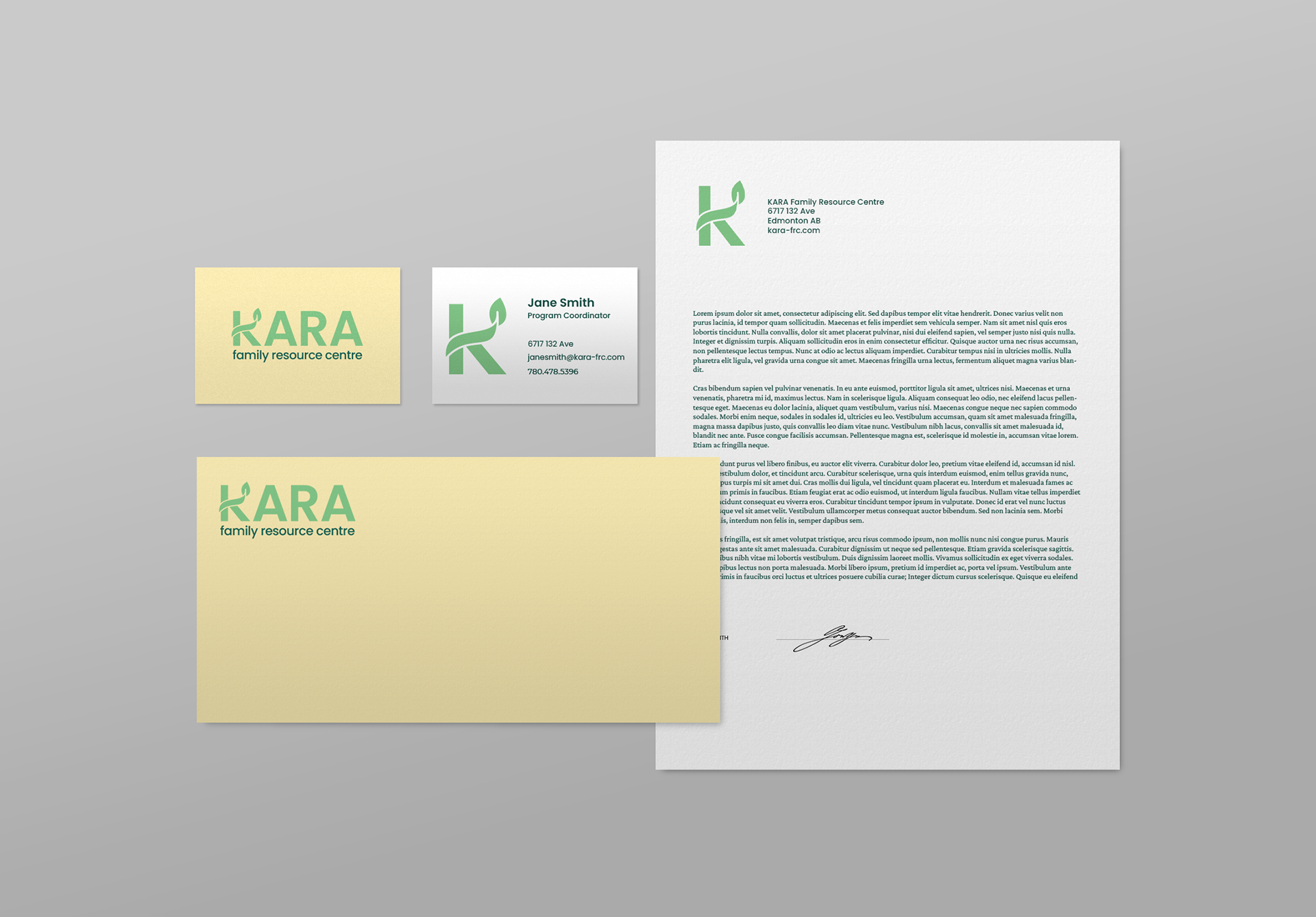 The rebrand is a modern, uncomplicated logo that can be used across multiple platforms, including environmental settings, letterheads, and business cards. The new logo incorporates a leaf as a callback to the original logo and indicates growth and nurturing, essential elements of Kara’s services.